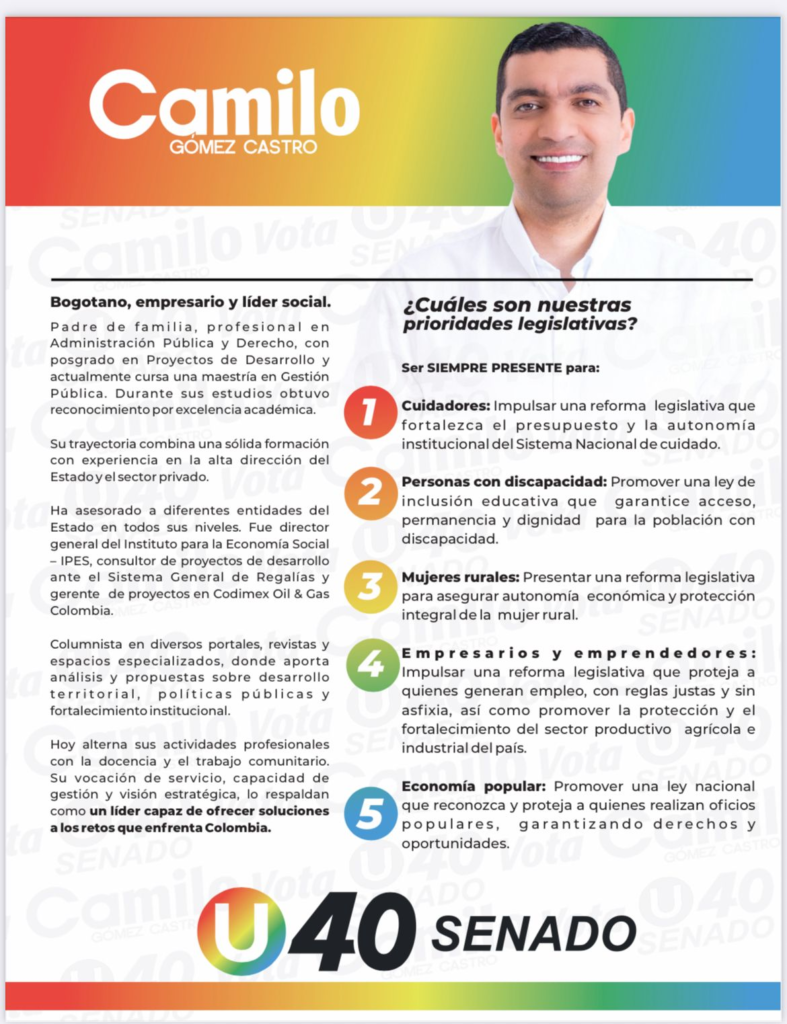 Con esta plataforma, el aspirante busca posicionarse como una alternativa enfocada en el desarrollo social, la inclusión y el fortalecimiento económico del país, de cara a su candidatura al Senado identificada con el número 40 en el tarjetón electoral.