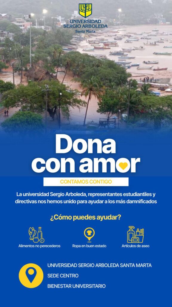 Asi mismo entidades educativas del sector privado, como la universidad Sergio Arboleda seccional Santa Marta. Sus directivas, representantes estudiantiles y toda la comunidad. Se han unido en una jornada de recolección por los estudiantes y familiares que se han visto vulnerados por esta tormenta.