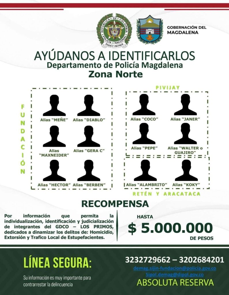 La Gobernación del Magdalena y la Policía Nacional han intensificado su lucha contra la criminalidad en la Zona Norte del departamento, presentando un cartel con los delincuentes más buscados y ofreciendo una recompensa de hasta 5 millones de pesos por información que conduzca a su identificación y captura.