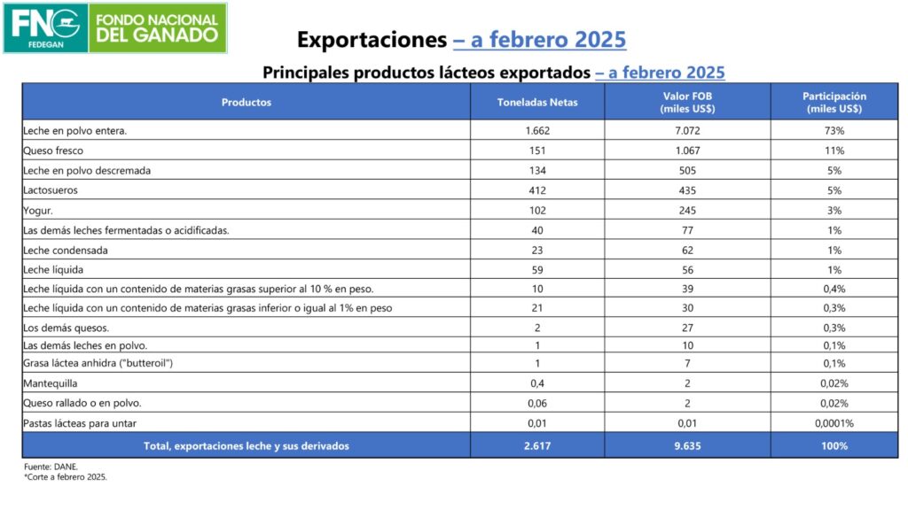 En cuanto a los productos lácteos, las exportaciones alcanzaron las 2.617 toneladas por un valor de 9,6 millones de dólares. Venezuela lideró con el 71 % de participación, seguido por Estados Unidos (22 %), Aruba (2 %), y pequeños volúmenes hacia Chile y Surinam.